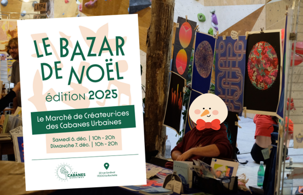 Le week-end du 6 et 7 décembre, on est fiers de vous annoncer le retour du chaleureux Bazar de Noël aux Cabanes Urbaines ! Comme chaque année, une jolie guirlande de talents locaux viendra faire briller les Cabanes de leurs créations éthiques et artisanales — l’occasion parfaite de dénicher des cadeaux pleins de sens pour les fêtes de fin d’année !Bijoux en pierres fines, illustrations sérigraphiées, douceurs gourmandes et autres trouvailles originales : il y en aura pour tous les goûts !